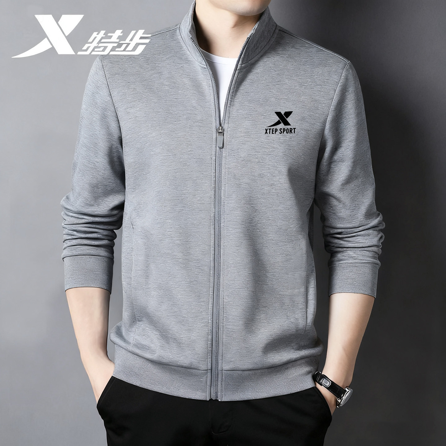 特步冬季加绒外套男灰色夹克男款2025新款正品保暖立领户外运动服