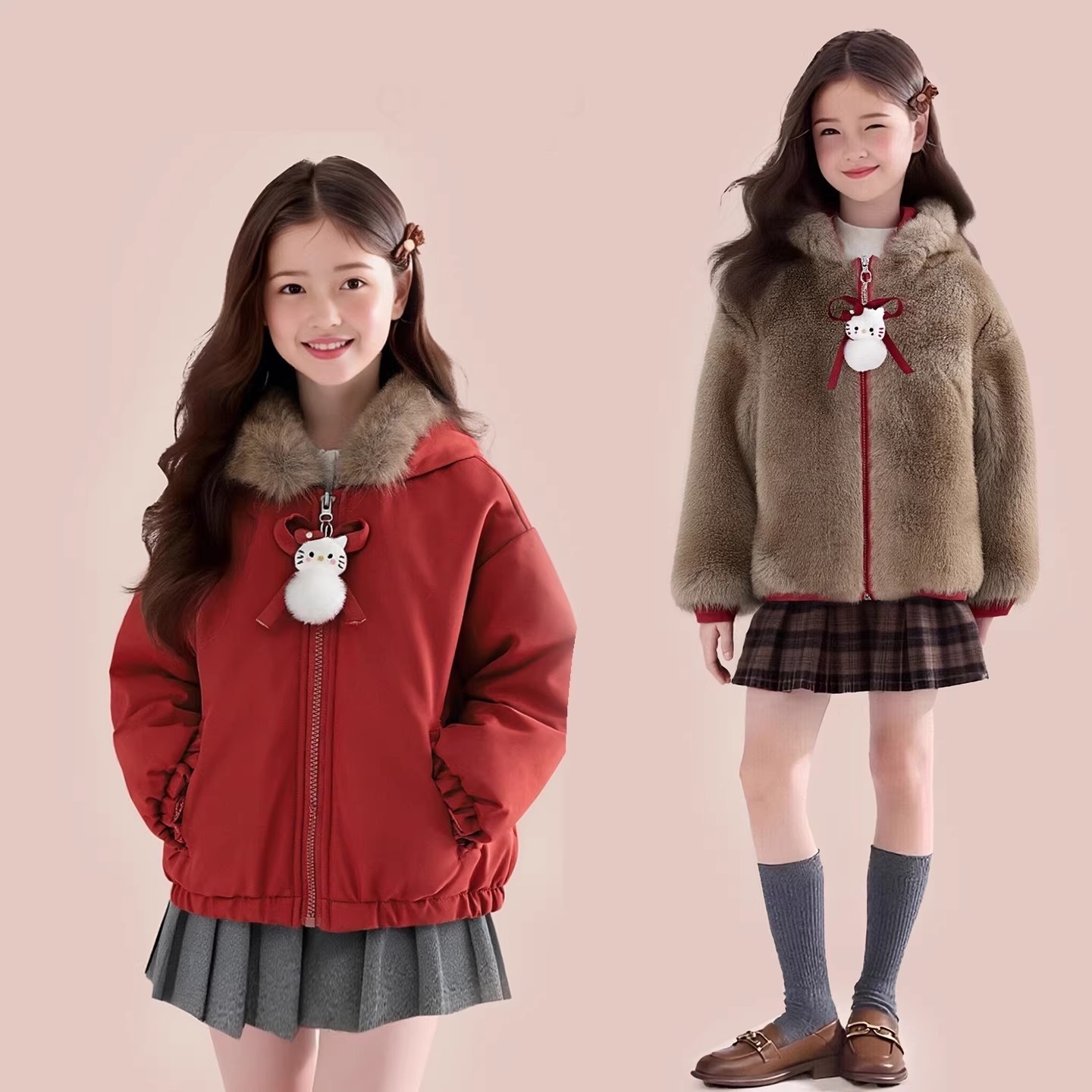 女童冬季加绒外套2025新款儿童加厚派克服女大童冬装双面穿毛毛衣