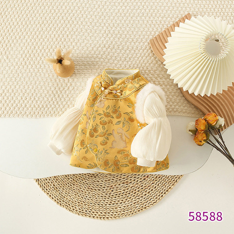 婴儿冬季加绒外套女宝宝黄色旗袍盘扣中式国风棉衣儿童新年拜年服