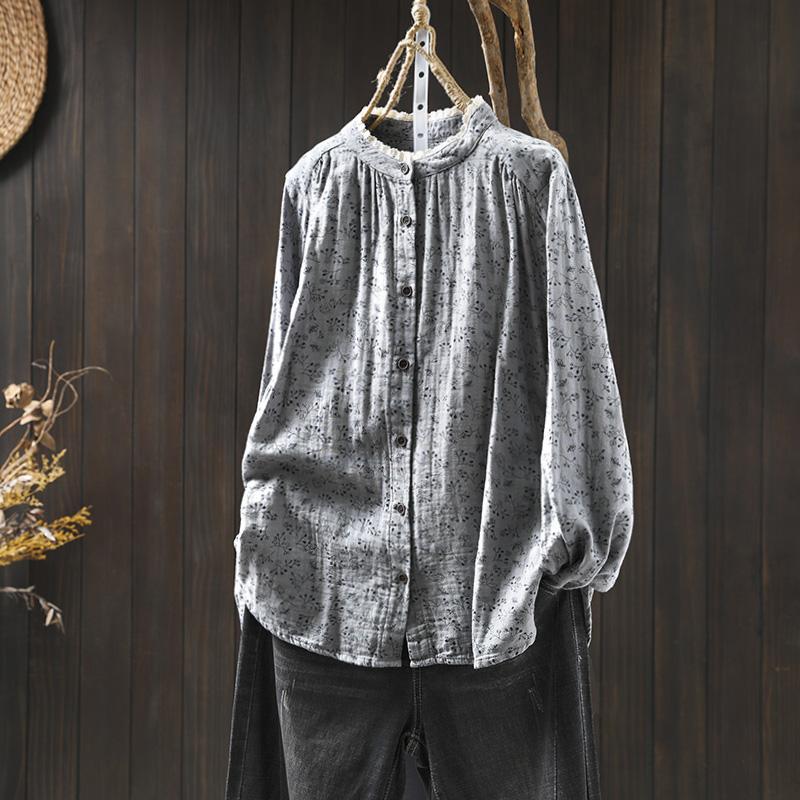 复古波点印花全棉双层棉纱衬衫女文艺立领中袖衬衣宽松显瘦上衣夏