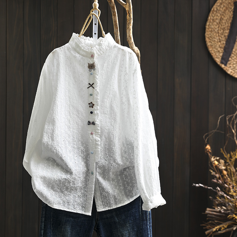 木耳边立领刺绣衬衫女秋季新款单排扣宽松显瘦百搭休闲上衣莉0.25