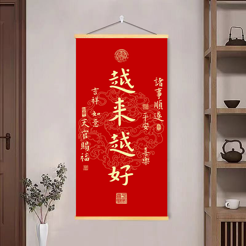 越来越好卷轴挂画新中式平安喜乐天官赐福新春客厅玄关装饰画墙贴
