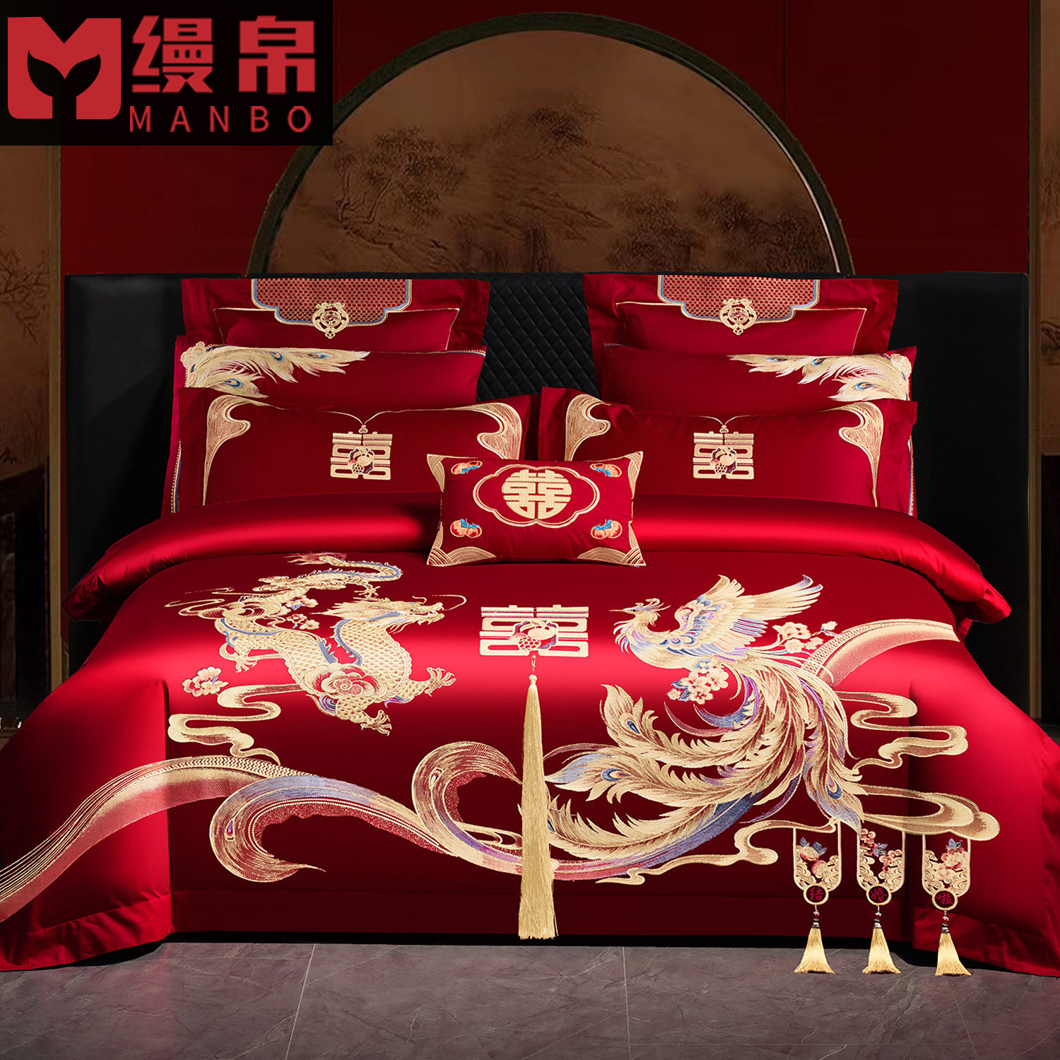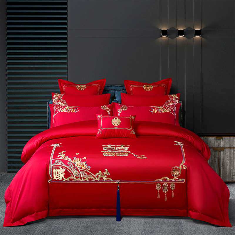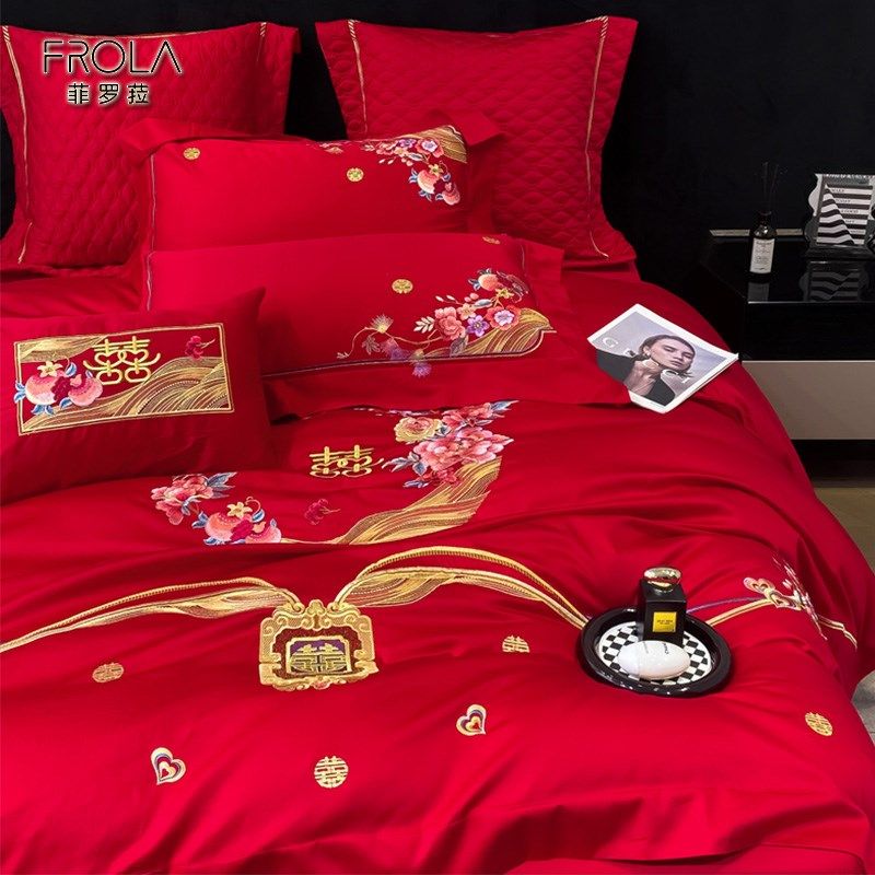 缦帛结婚四件套婚床上用品大红色新婚婚庆床品六件套刺绣婚嫁喜被