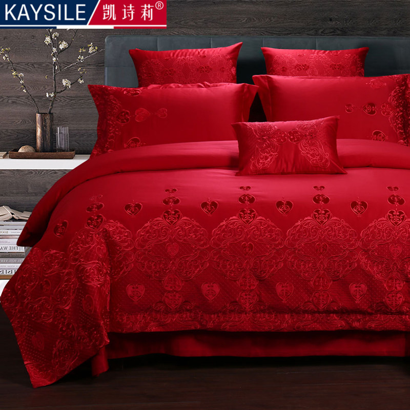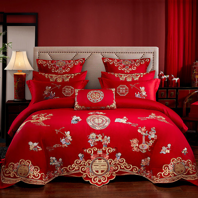 100s支全棉婚庆四件套大红色喜被子结婚六十件套刺绣婚房床上用品