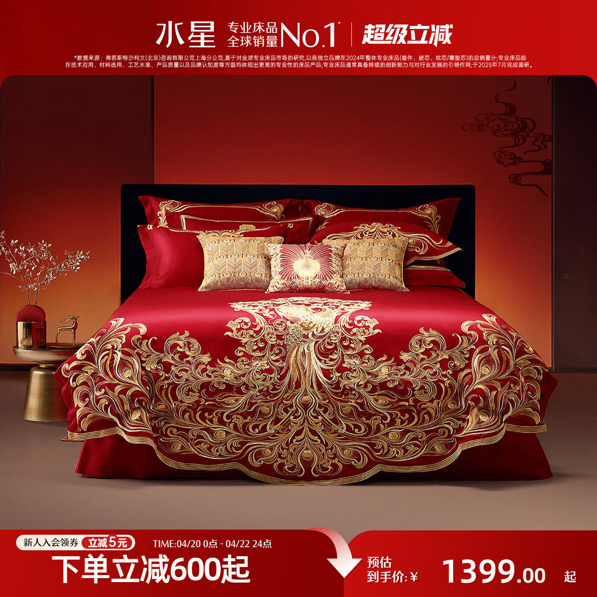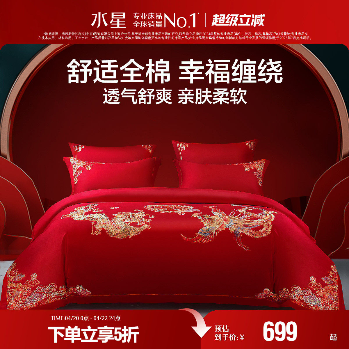 水星家纺60支长绒棉四/六件套红色婚庆结婚轻奢高端新婚喜庆床品