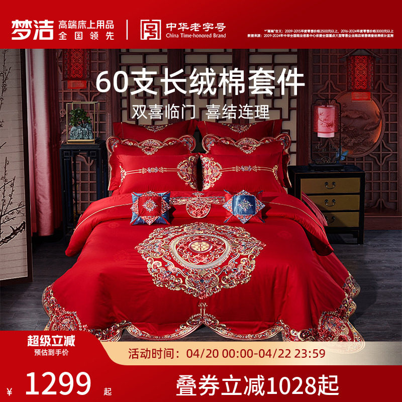 梦洁家纺纯棉婚庆刺绣六件套大红色喜庆结婚床品套件床单床上用品