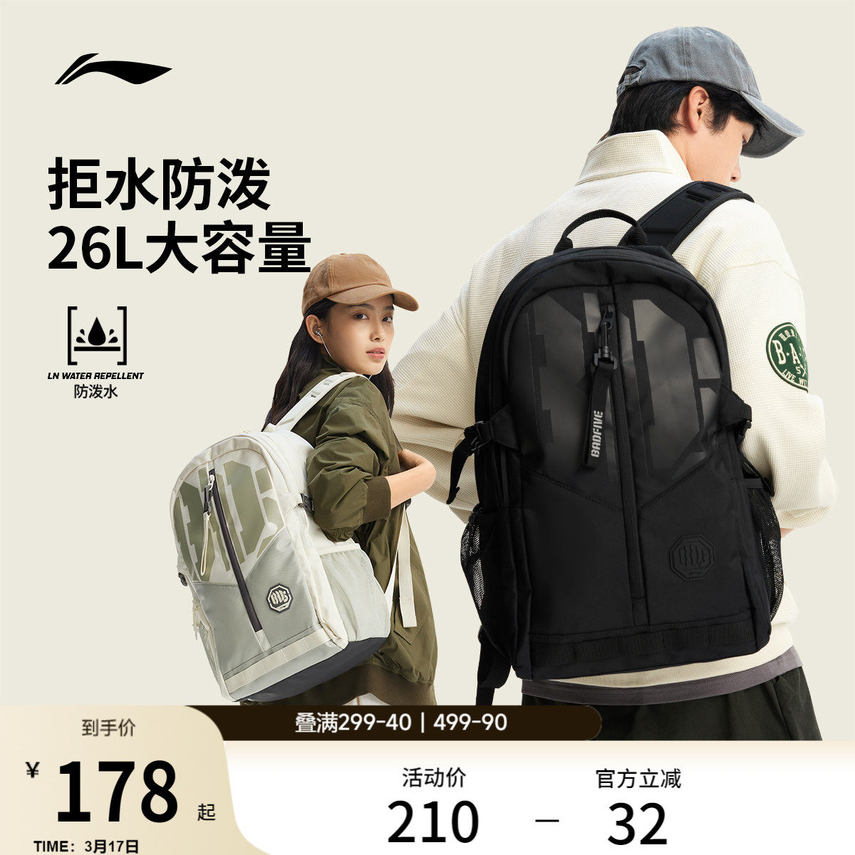李宁反伍双肩包男包新款初高中学生通勤书包大容量户外运动背包女
