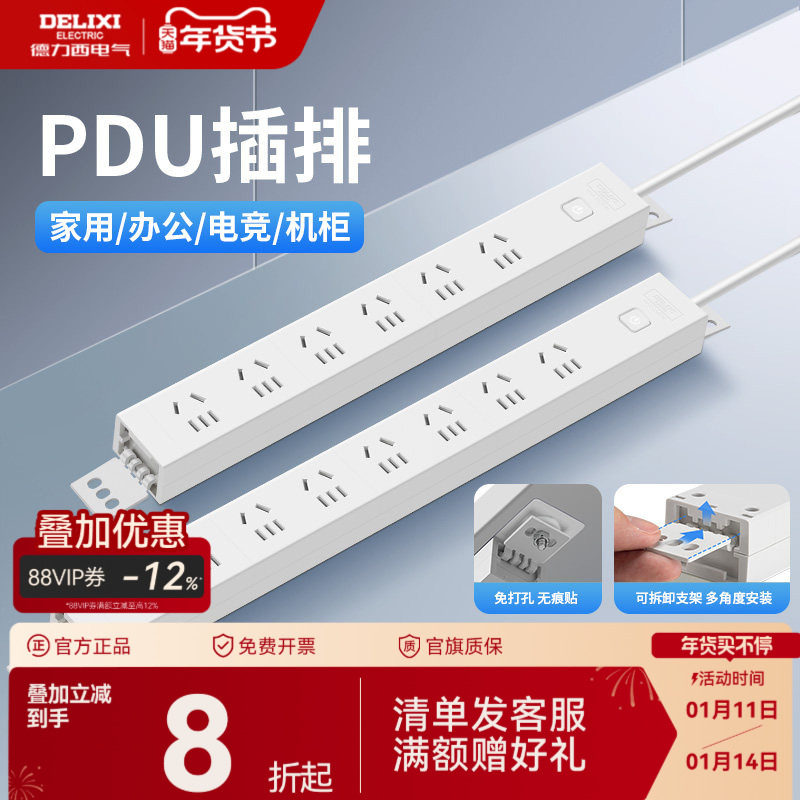 德力西插排pdu机柜插座桌下免打孔接线板家用多孔位电竞排插旗舰