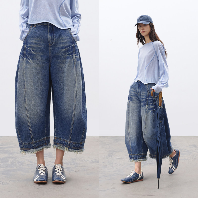 纯棉 半圆女装[复古]2026春季宽松休闲牛仔水洗九分萝卜裤子女