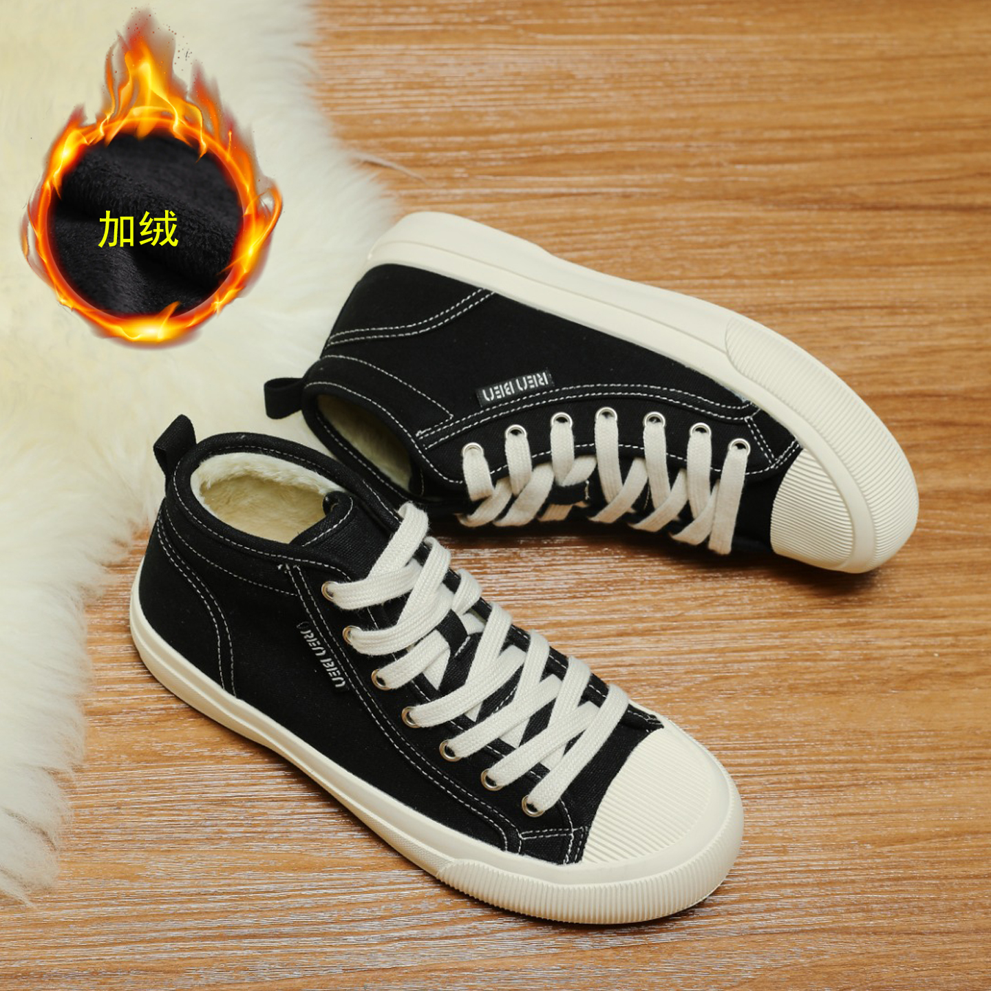 人本女鞋冬季加绒帆布鞋学生棉鞋中高帮透气平跟板鞋休闲鞋保暖鞋