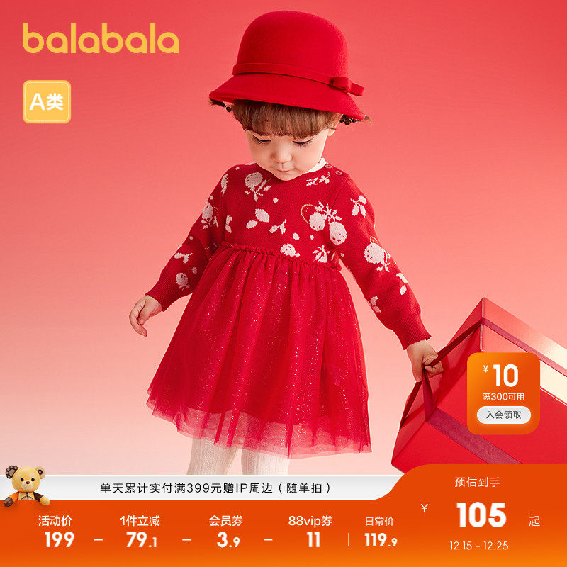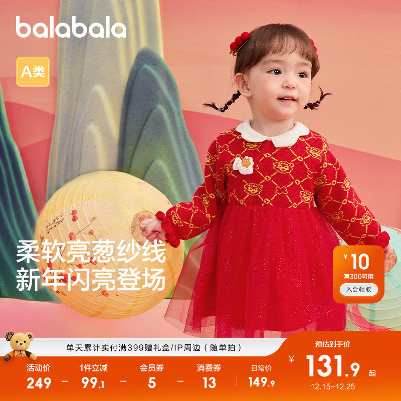 巴拉巴拉童装婴儿女童连衣裙2025春秋新款红色拜年服甜美针织裙子