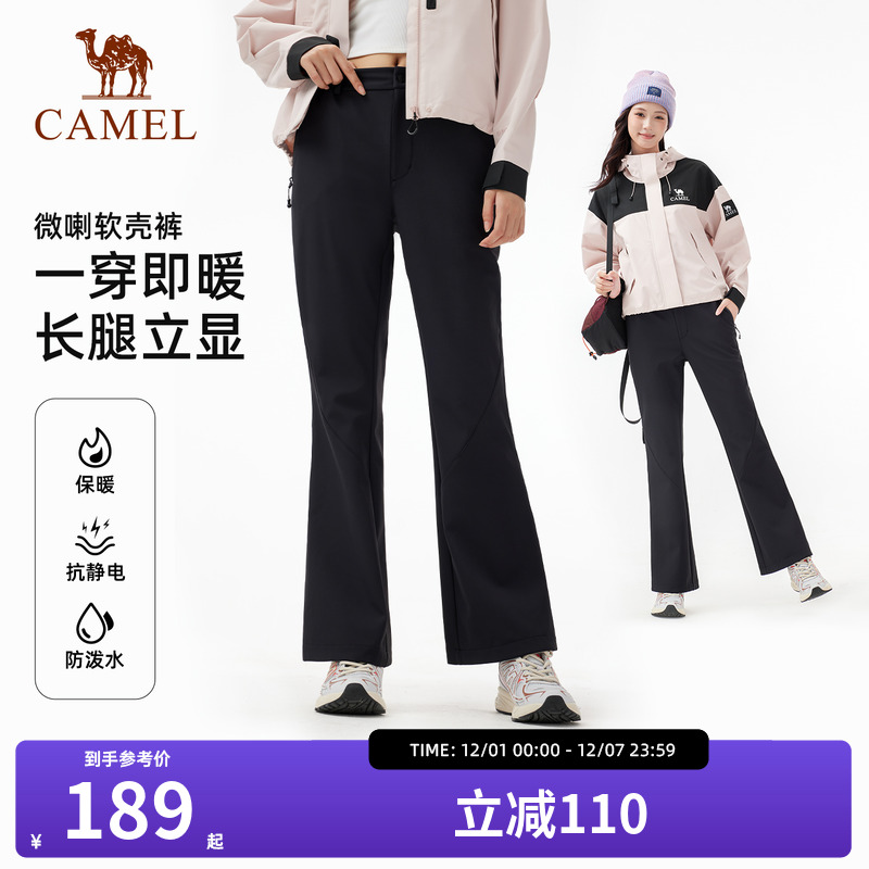 骆驼户外软壳裤女秋冬加绒保暖抗静电防泼水微喇叭裤徒步登山长裤