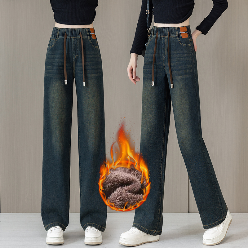 广州新塘女款牛仔裤2025年新款加绒加厚冬季秋季松紧腰窄版阔腿裤
