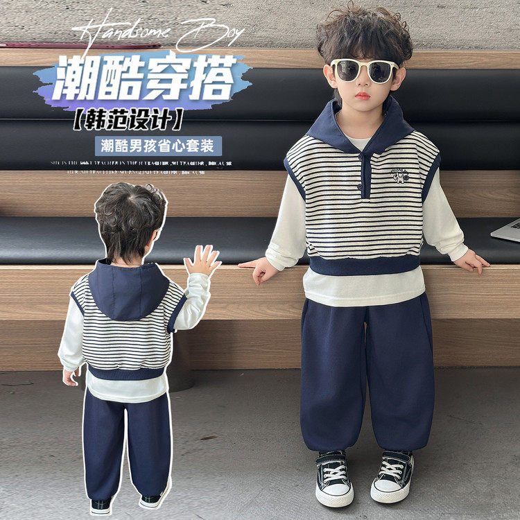 INSbobo男童套装2026新款春装儿童马甲三件套男孩时髦衣服春秋潮