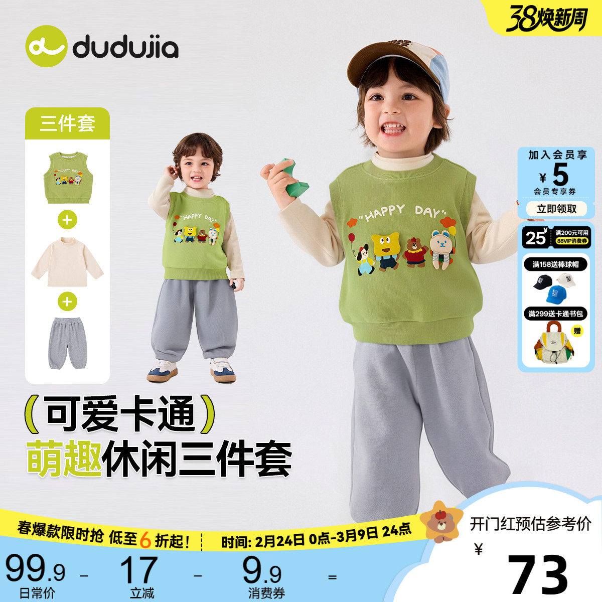 嘟嘟家儿童套装春秋男童三件套卡通女童马甲春装宝宝上衣裤子童装