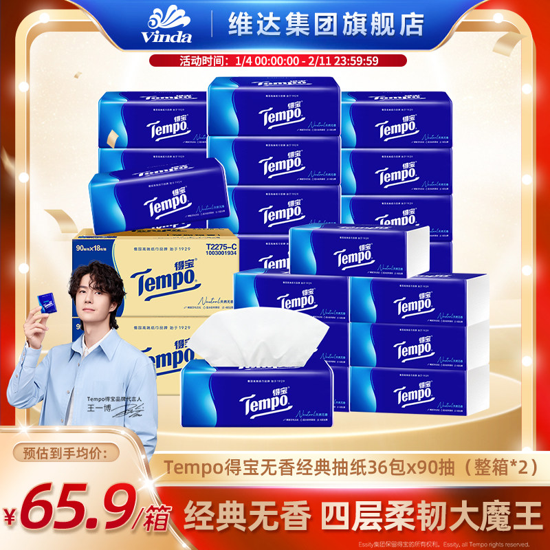 【进直播间】Tempo得宝无香抽纸家用抽取式纸巾餐巾纸4层18包90抽