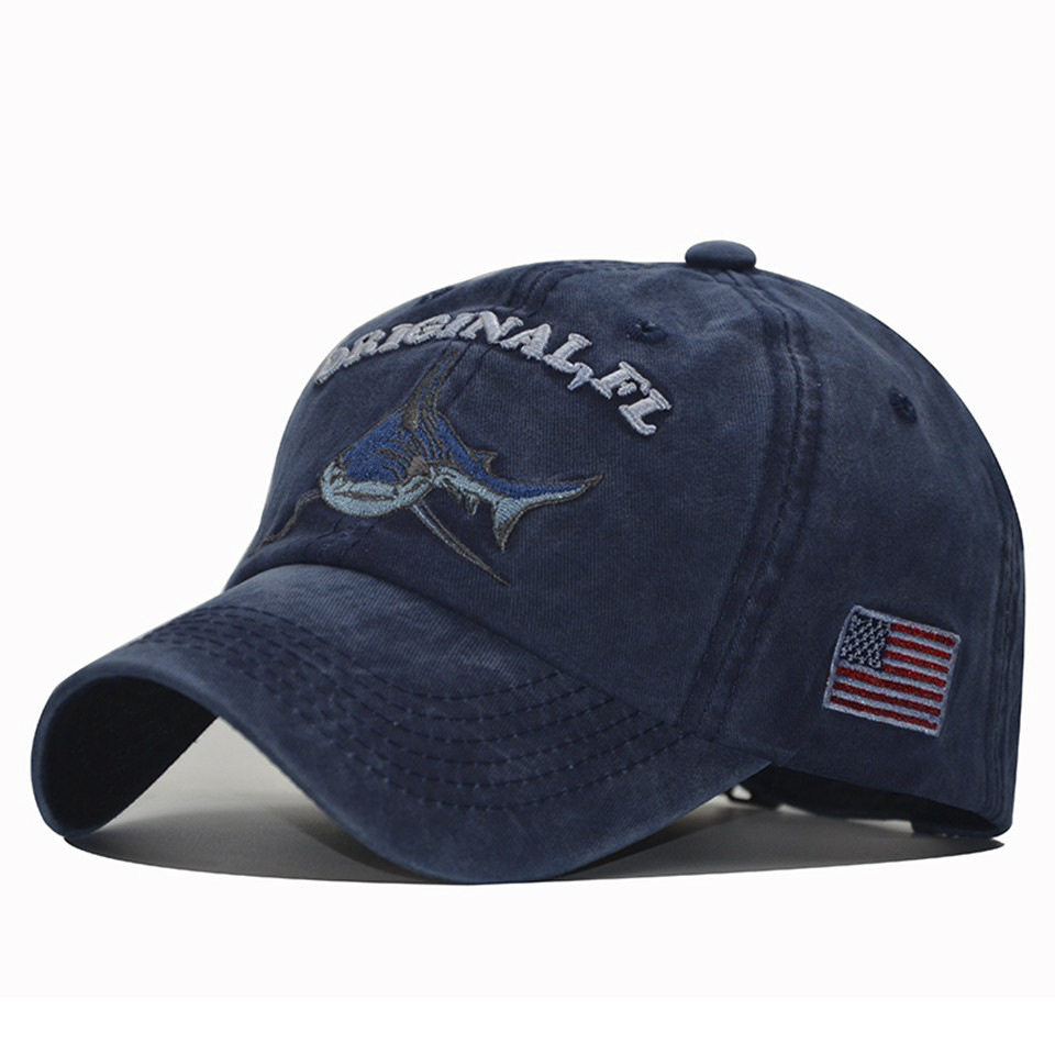 新款欧美布贴动漫鲨鱼刺绣水洗牛仔棒球帽户外运动遮阳鸭舌水洗帽