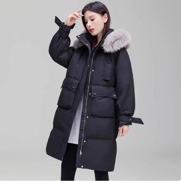 正品撤柜25冬羽绒服女版廓中长韩白鸭141-2024绒款狐狸毛形领长款