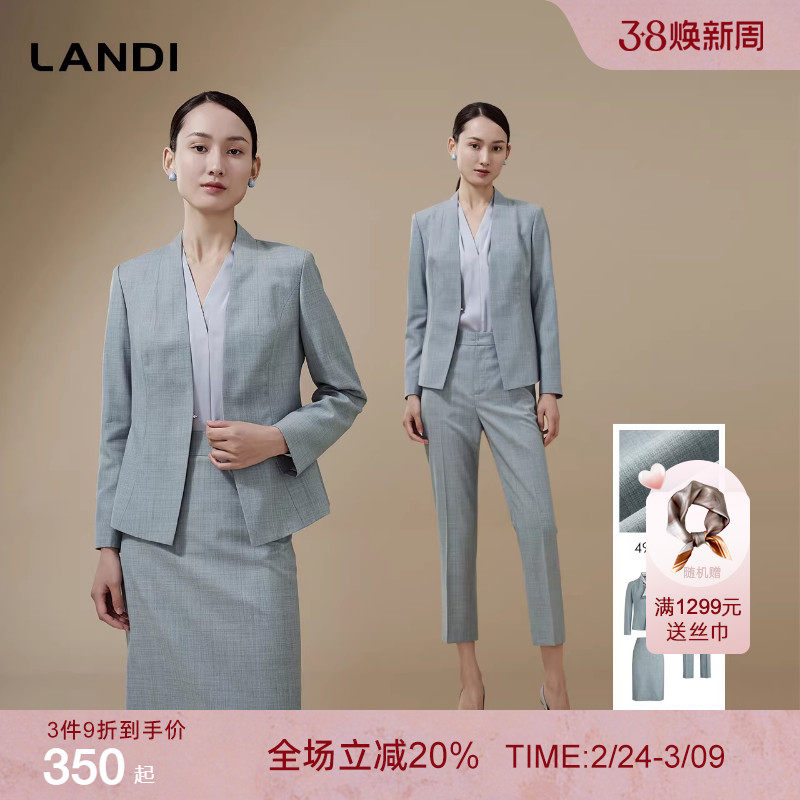 [绵羊毛轻职套装]LANDI无领收腰西服外套女西装裤半裙套装秋新品