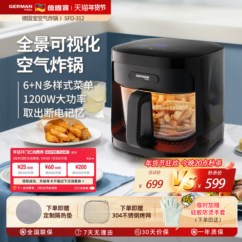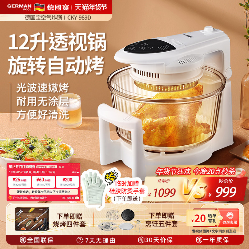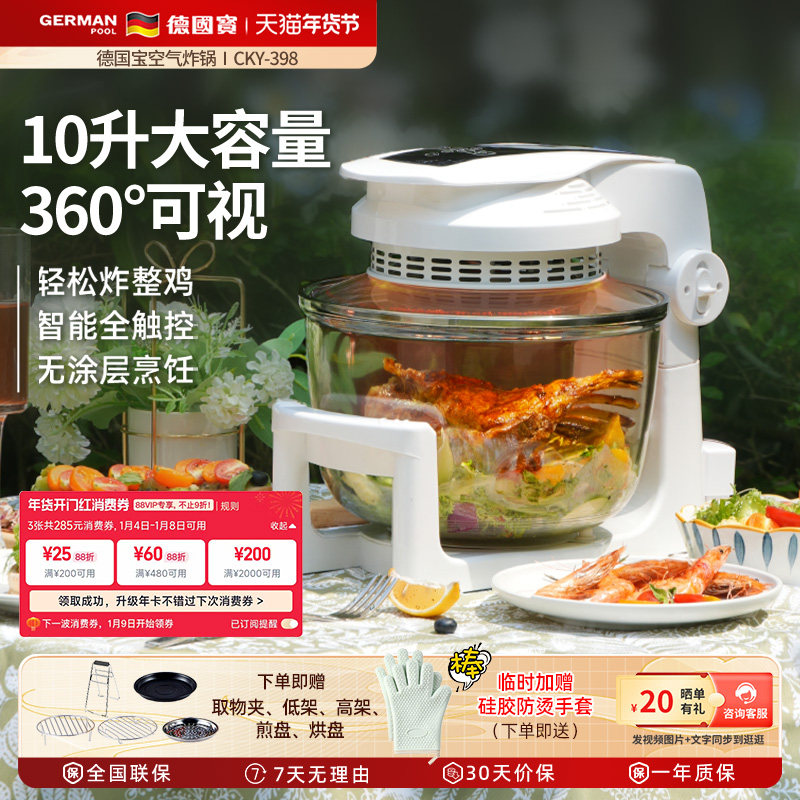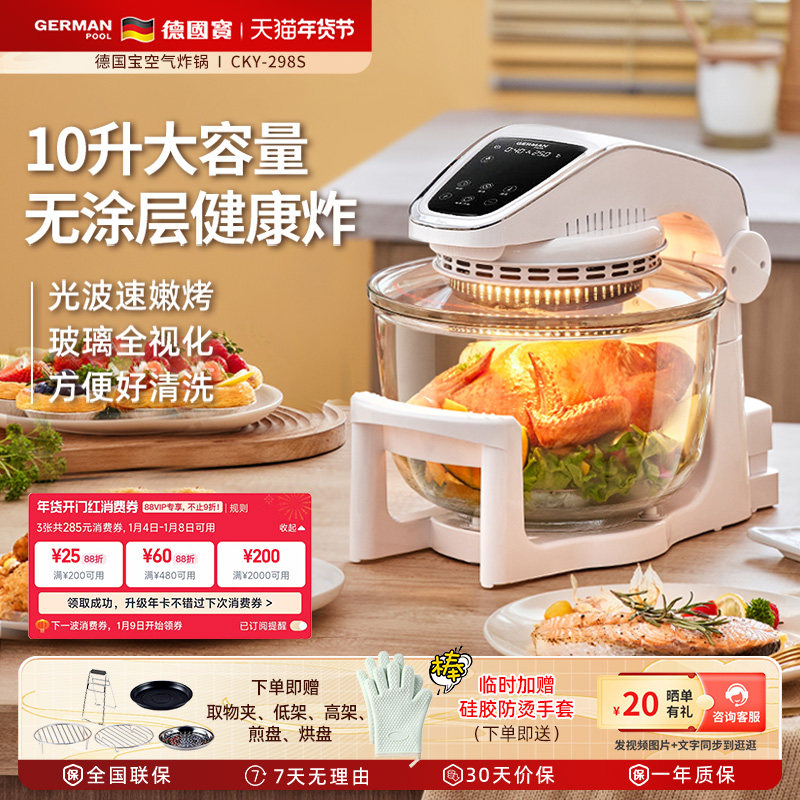 德国宝空气炸锅顶部加热炎烤锁水嫩烤玻璃内胆无涂层空气炸锅家用