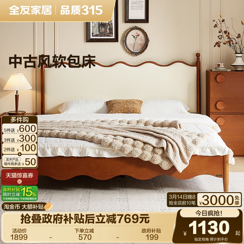 政府补贴全友家居法式复古双人软包床中古风主卧涟漪大床实木脚床