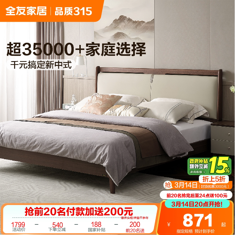 政府补贴全友家居新中式主卧室1米8软包大床实木床脚1米5双人皮床