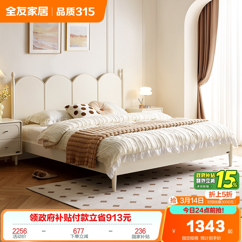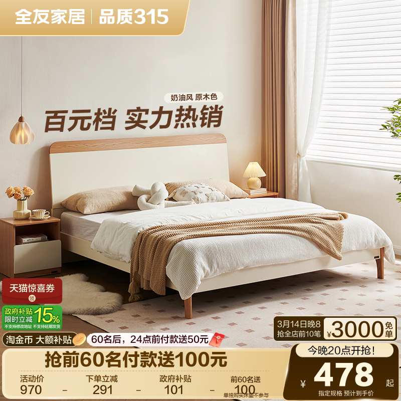 政府补贴全友家居实木床脚1米8双人床奶油原木风卧室床1米5家具