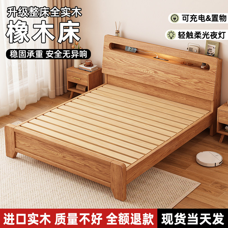 床实木床1米8双人床家用卧室原木风可充电1.2橡木1.5米单人床床架