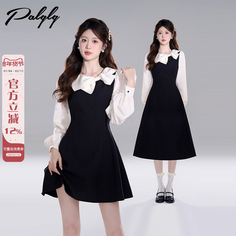 Palglg法式千金风拼接长款黑色连衣裙女冬季赫本风收腰长裙小黑裙