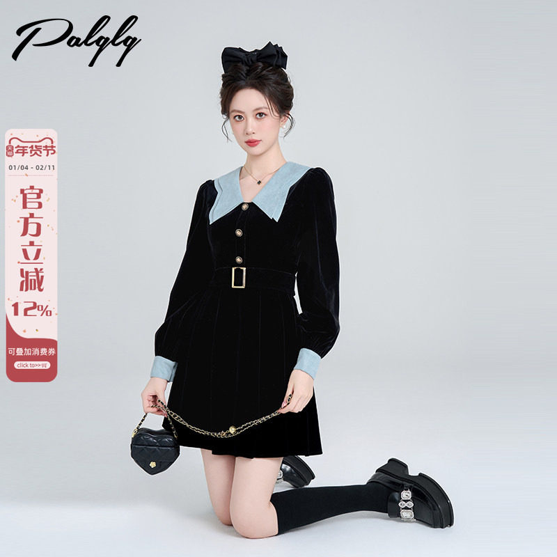 Palglg高级感黑色丝绒赫本连衣裙女冬季假两件miu系千金风收腰裙