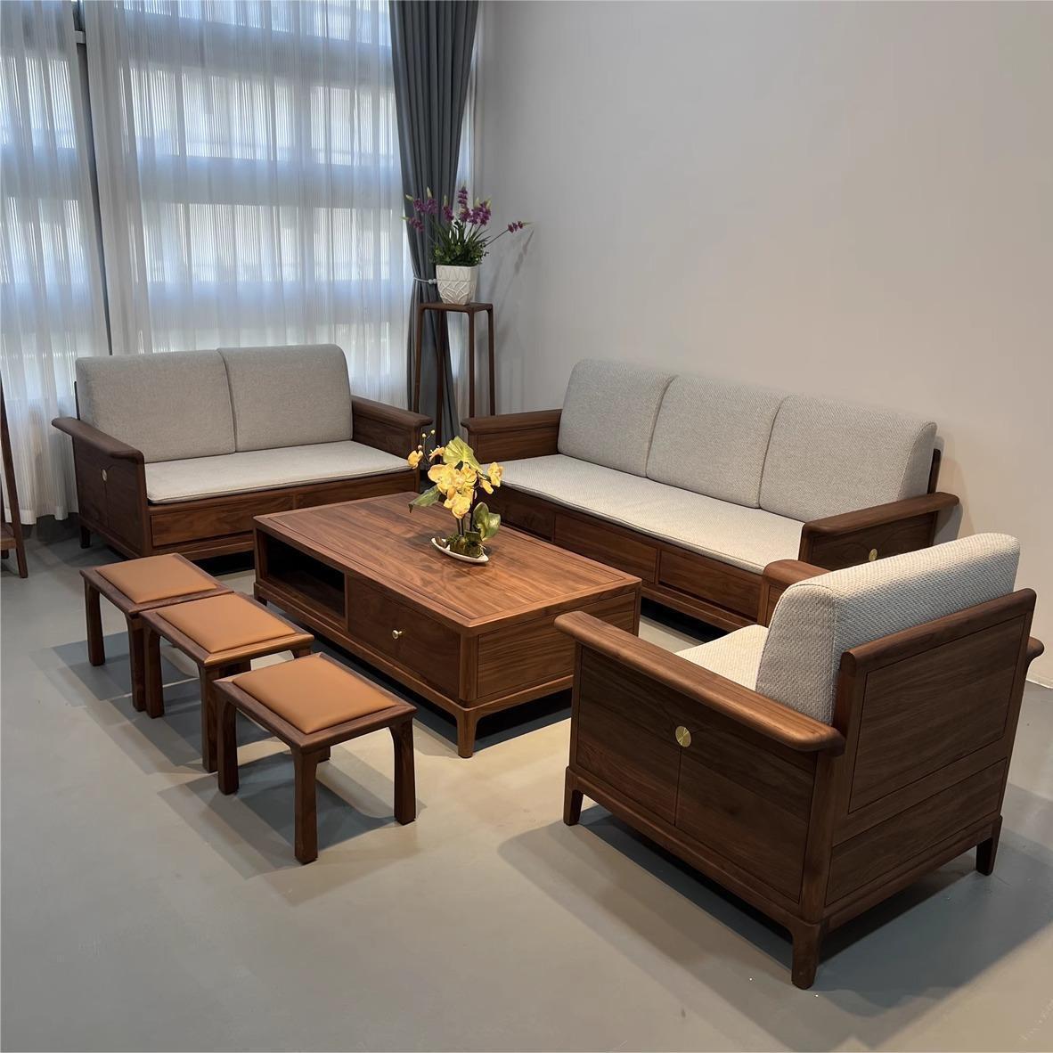 新中式黑胡桃木实木沙发全实木客厅组合大小户型储物原木布艺沙发