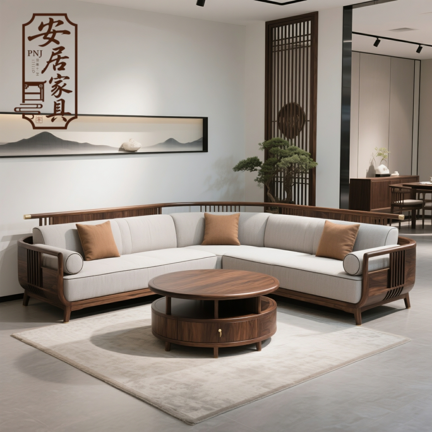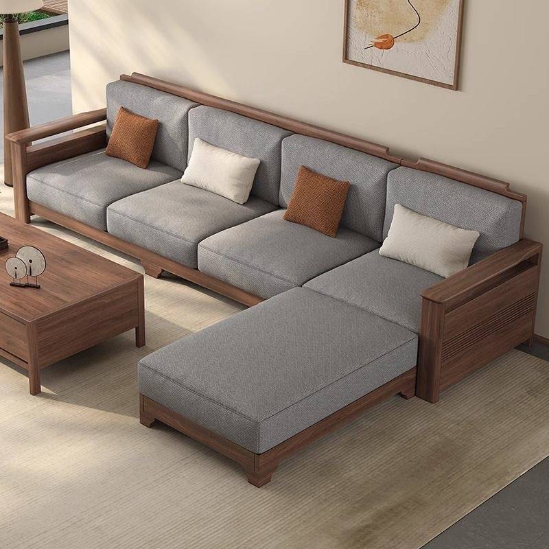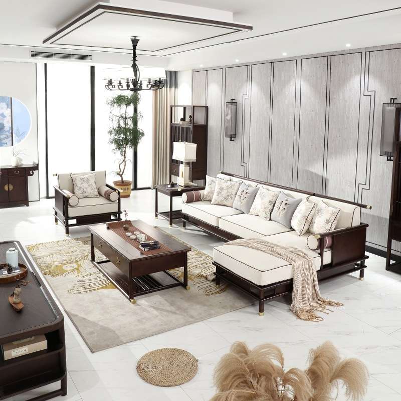 新中式北美黑胡桃木转角沙发组合别墅客厅高级感布艺实木沙发定制