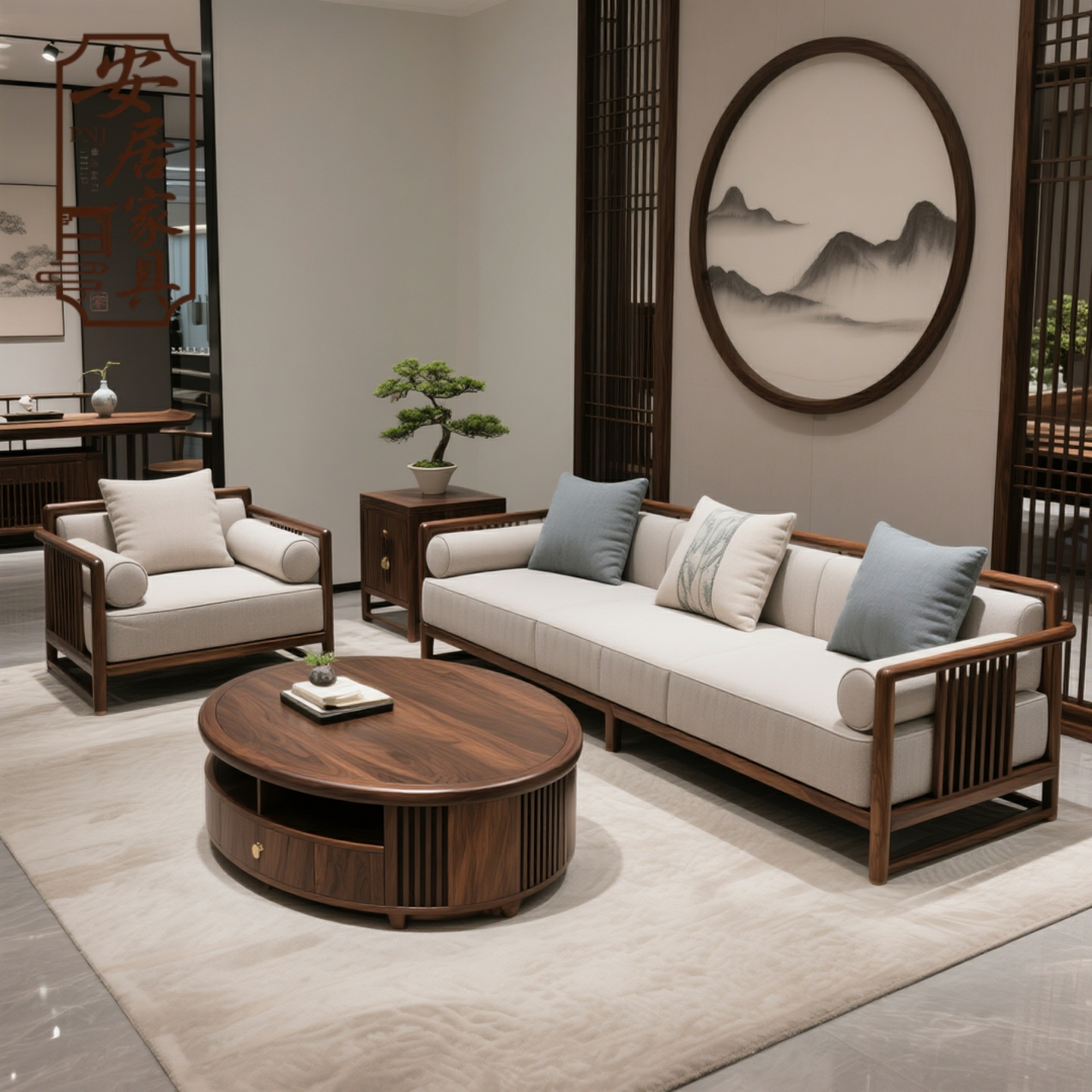 新中式北美黑胡桃木实木沙发组合大平层禅意简约布艺罗汉床榻定制