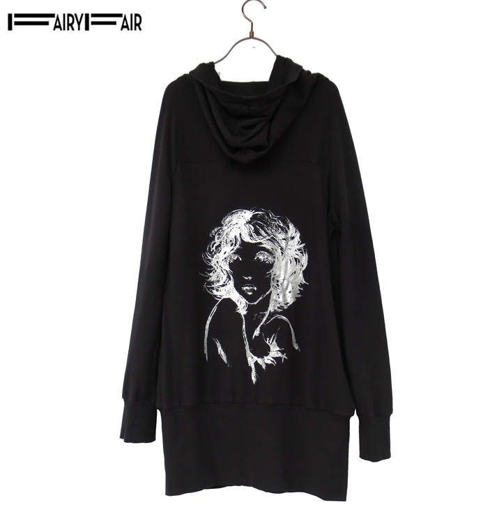 FAIRYFAIR专柜正品黑色印花连帽加长款针织衫外套卫衣女