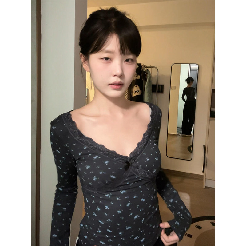 美式复古低V领碎花打底衫女秋冬保暖内搭正肩长袖t恤修身辣妹上衣