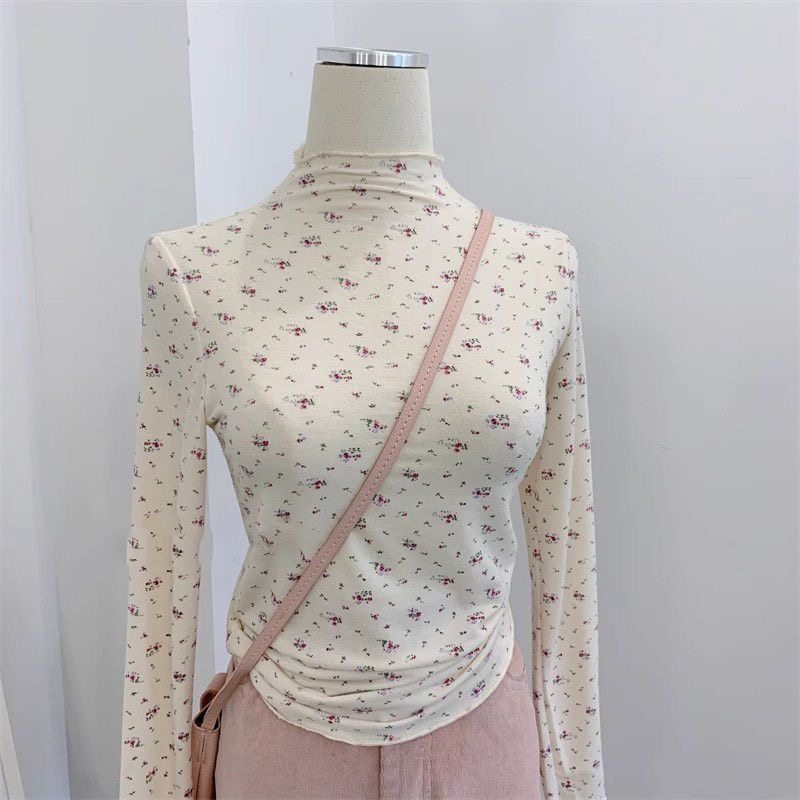 半高领碎花打底衫女春秋薄款长袖修身t恤秋衣大码可外穿休闲上衣