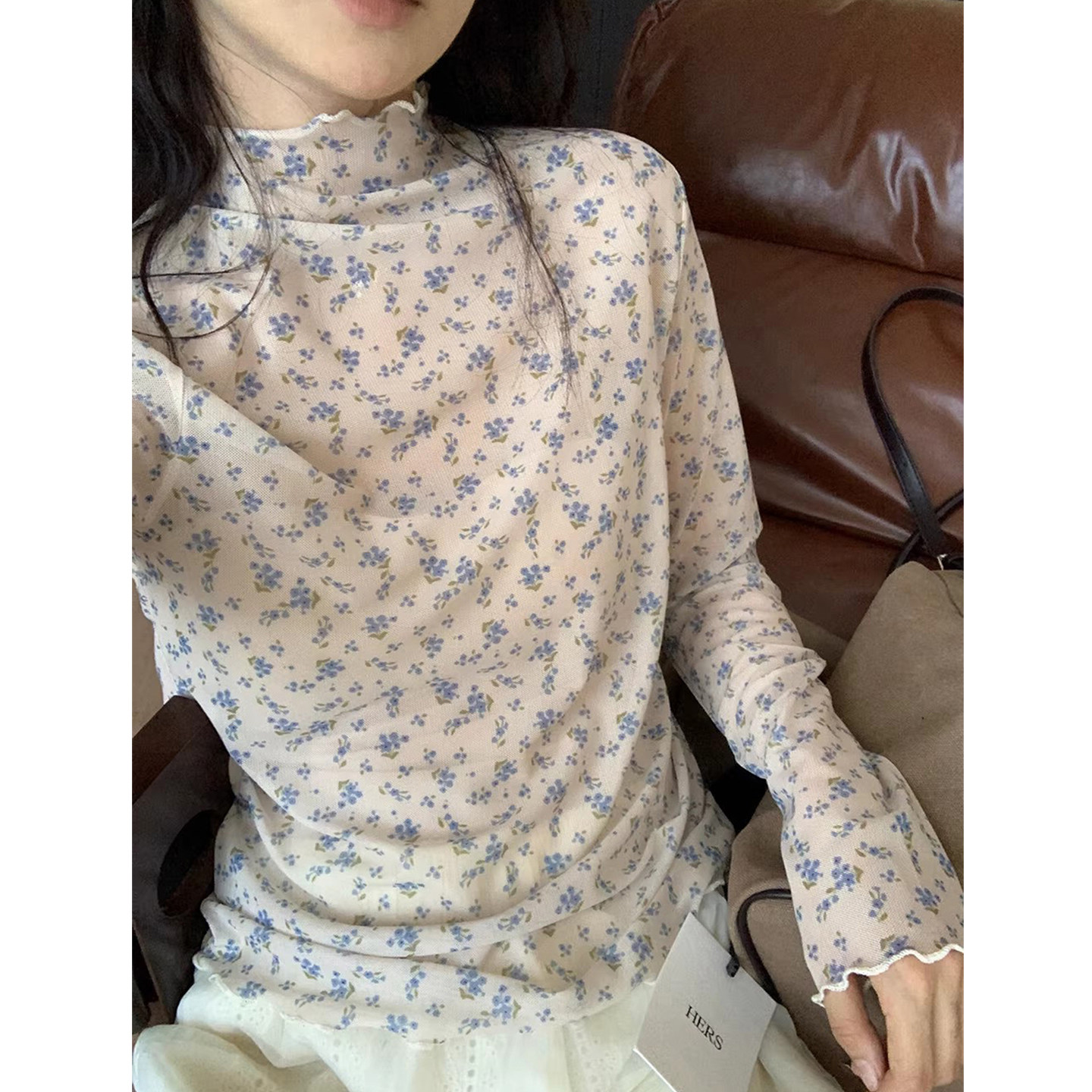 纯欲风半高领森系小碎花打底衫女长袖上衣内搭甜美波浪领T恤韩系