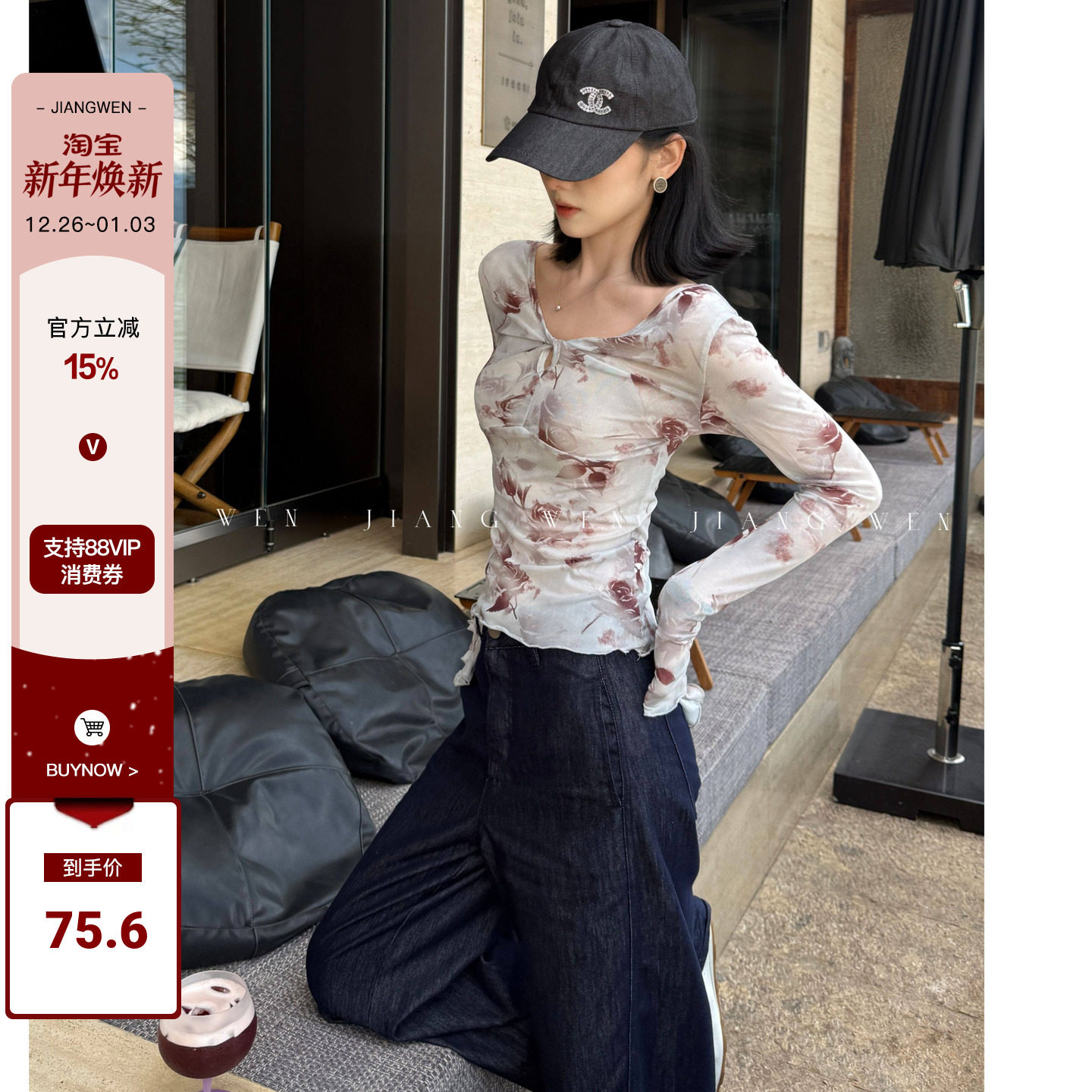 JMWOMEN复古碎花长袖T恤女秋冬修身假两件木耳边花瓣袖打底衫上衣