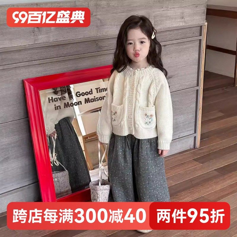 女童针织开衫毛衣外套秋装2024新款儿童碎花打底衫女宝宝早秋套装