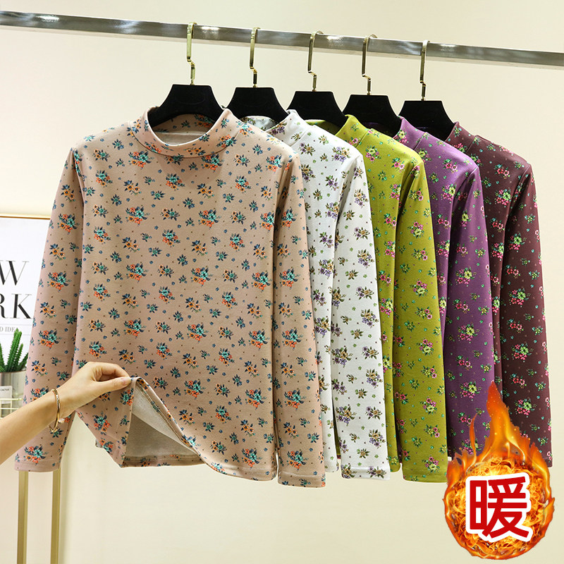 半高领碎花打底衫女秋冬大码长袖t恤上衣可外穿加厚休闲保暖秋衣