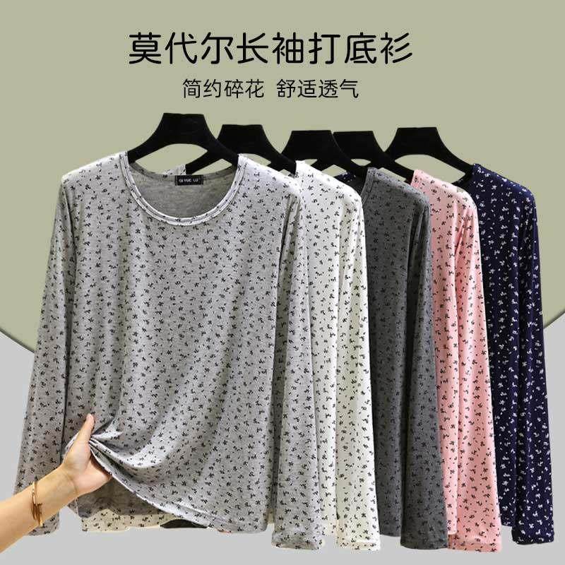 莫代尔圆领碎花打底衫女秋薄款长袖宽松显瘦内搭上衣休闲大码T恤
