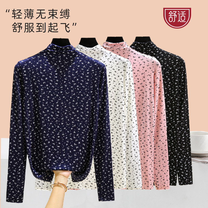 莫代尔半高领碎花打底衫女秋冬内穿薄款秋衣修身显瘦长袖上衣T恤