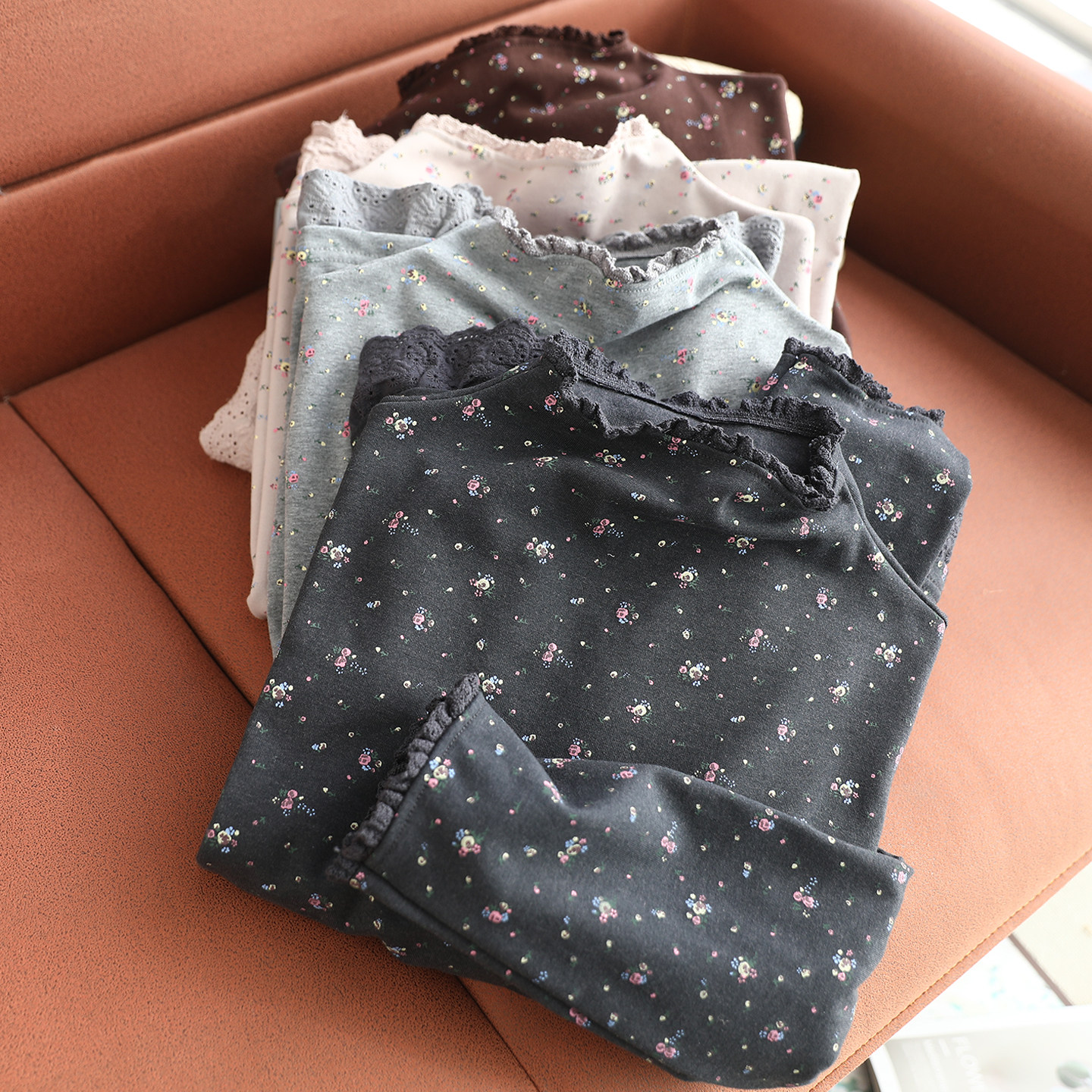 新款森女系花边半高领碎花打底衫女宽松百搭棉质叠穿T恤套头上衣