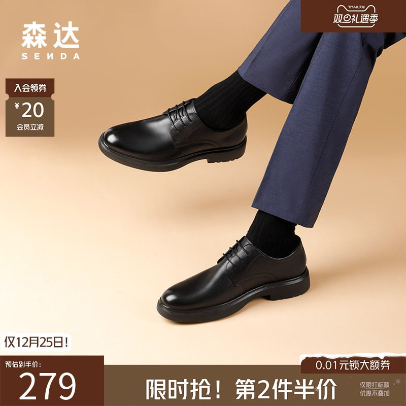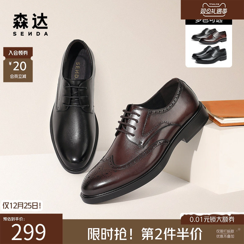森达男鞋正装皮鞋布洛克雕花商务通勤德比鞋商场同款真皮增高婚鞋