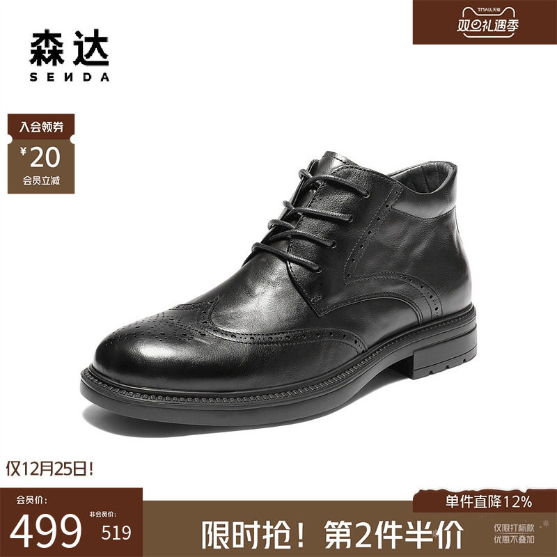 森达皮靴男鞋2025冬新款厚底牛皮布洛克雕花商务休闲短靴VD005DD5