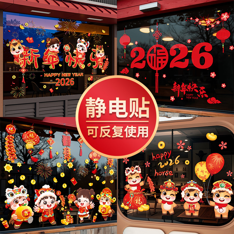 2026马年新年春节装饰静电贴窗贴玻璃门贴纸窗花贴画元旦过年布置