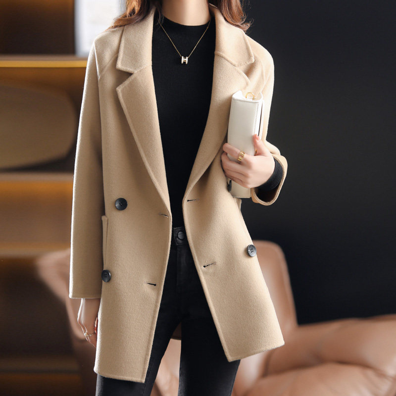女士短款手工羊毛外套双排扣西装领纯色双面毛呢大衣长袖纯色羊毛