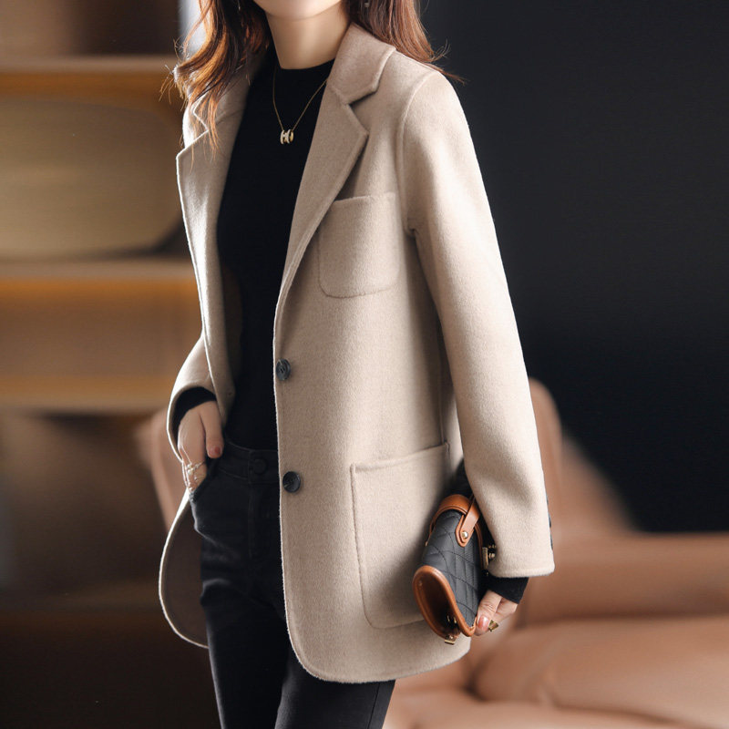 女士短款手工羊毛外套单排扣西装领纯色双面毛呢大衣长袖纯色羊毛