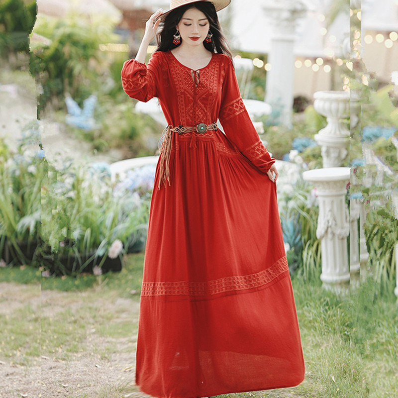 海边度假波西米亚旅游连衣裙民族风女装云南丽江西藏沙漠红色长裙