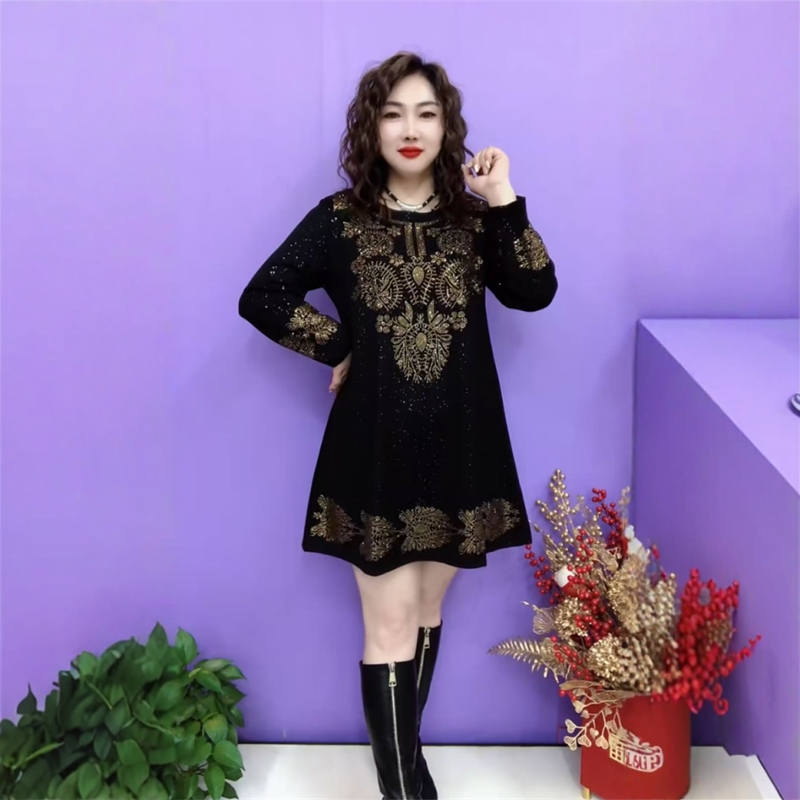 秋季新款亮钻民族风连衣裙宽松遮肚显瘦时尚减龄洋气百搭大版衫裙